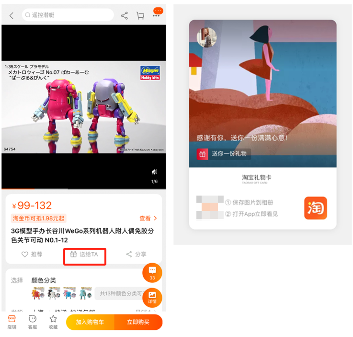大约在2020年前后,淘宝用户可以通过「送给TA」的功能表达心意。在选定的商品页,用户点击「送给TA」并编辑祝福语后,会生成一张可以图片形式保存的礼物卡。
