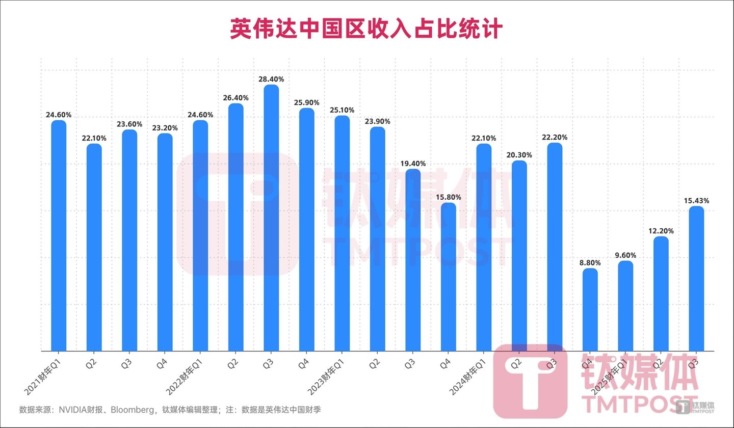 硅基世界统计了2021年至今英伟达每个季度在中国区的收入总额占全球营收占比,显示出中国市场对于英伟达至关重要。最新2025财年第三季度(2024自然年第二季度),英伟达15.4%占比、约54.16亿美元收入来自中国市场,仅次于美国。
