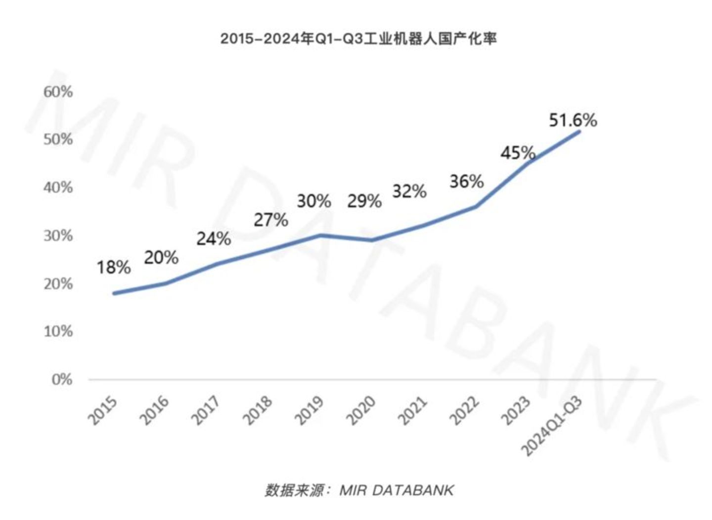 据市场研究机构MIR DATABANK公布的数据,2024年前三季度,中国工业机器人厂商同比增速达21.1%,远高于整体市场增速。同时,2024年前三季度内资厂商市场份额提升至51.6%,较2023年同期增长4.5个百分点,从销量口径上首次实现对外资品牌的反超。