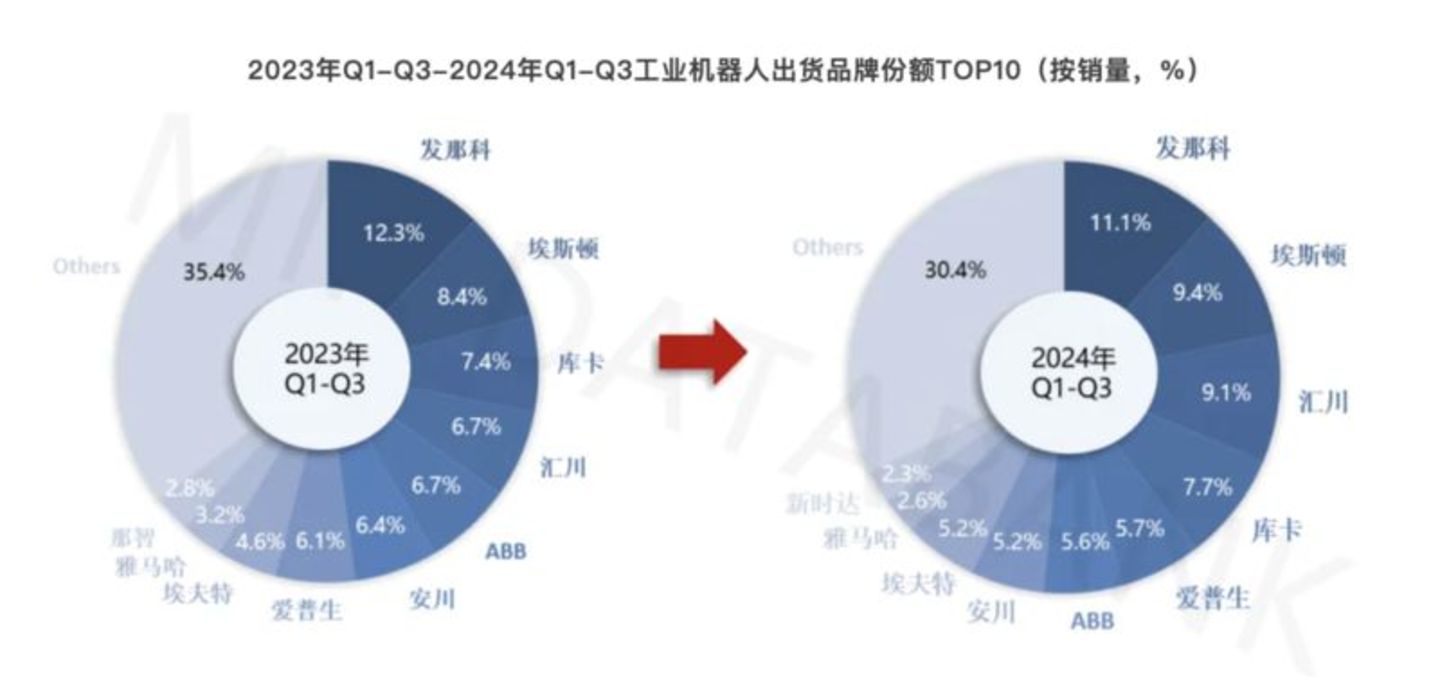 与此同时,中国企业仍穷追不舍。2024年前三季度,日本企业虽依然占据全球T10前列,但其市场份额正在快速下降。例如,2024年Q1-Q3,发那科和安川的市场份额相比上年同期都减少了1.2个百分点,而同期中国企业埃斯顿和汇川的市场份额却分别增加了1%和2.4%。