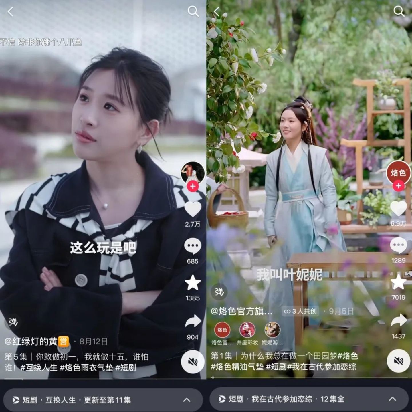 只是现在的玩法,除了去年火热过一阵的达人定制短剧,变成了更有内容属性的品牌自制剧和付费植入剧。在后链路上,更是出现了达人下剧后直接上播、播后落地搜索等玩法。《我在古代参加恋综》短剧上线后,店播+达播总GMV超过4700万,烙色一举成为抖音彩妆榜前三。