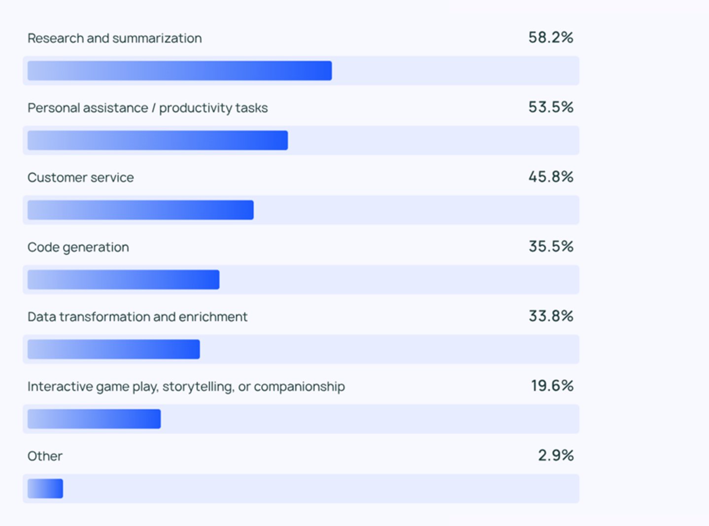 LangChain调查显示:研究与总结(58%)、个人生产力工具(53.5%)、客户服务(45.8%)。