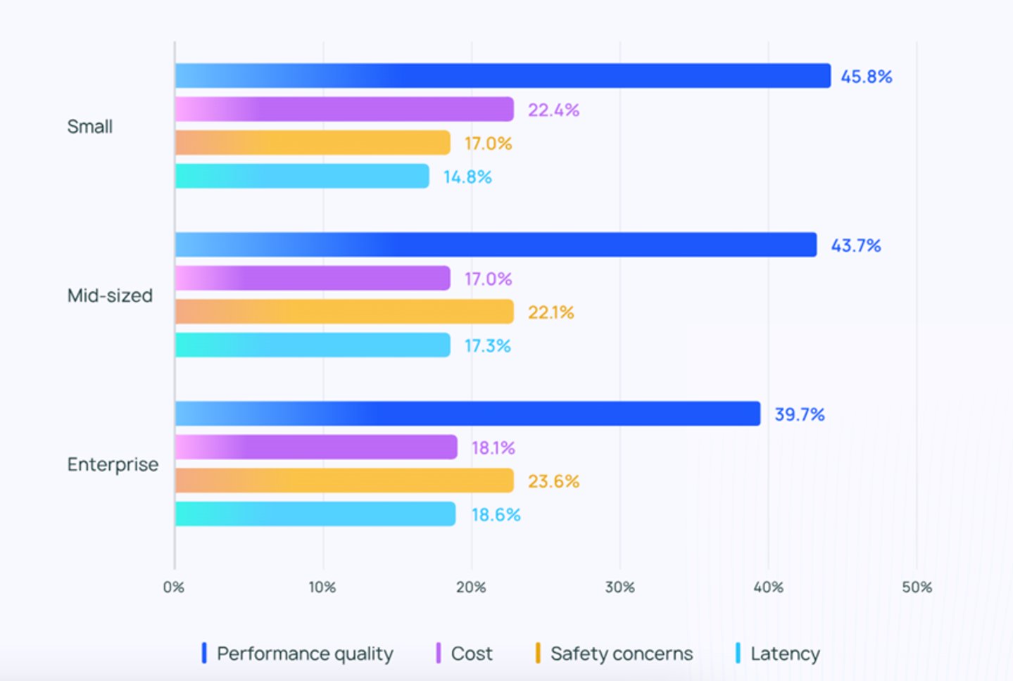 对于小企业而言,性能质量尤其重要——45.8%的小企业将性能质量列为主要关注点,而成本因素仅为 22.4%。