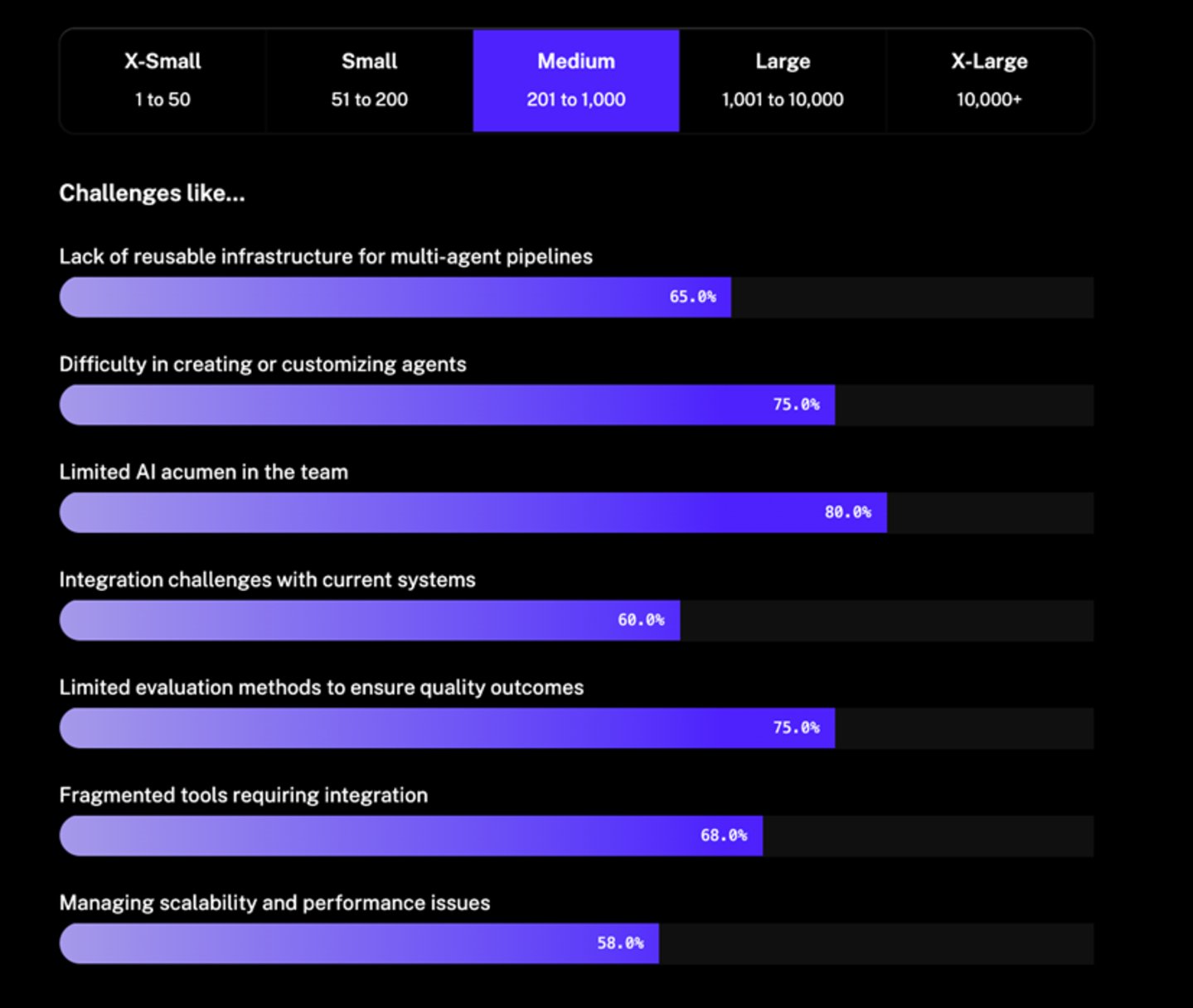 大多数受访者需要多代理RAG能力以提高上下文信息处理;评估工具对于确保AI系统按预期工作同样很重要;多代理流水线也是在生产中实现复杂任务的关键技术。