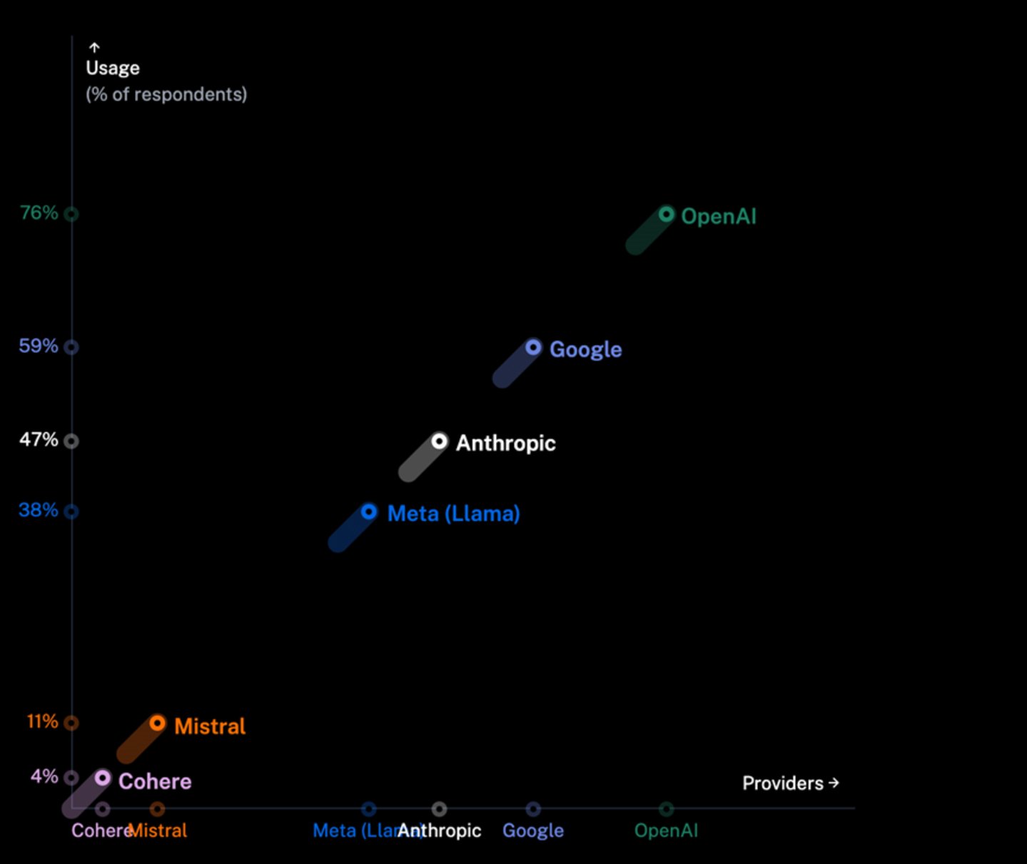 Langbase调查显示:OpenAI(76%)占据主导地位;谷歌(59%)正迅速崛起,成为其强劲的竞争对手;Anthropic(47%)紧随其后。Meta的Llama、Mistral和Cohere影响力不高,但增长势头不容忽视。