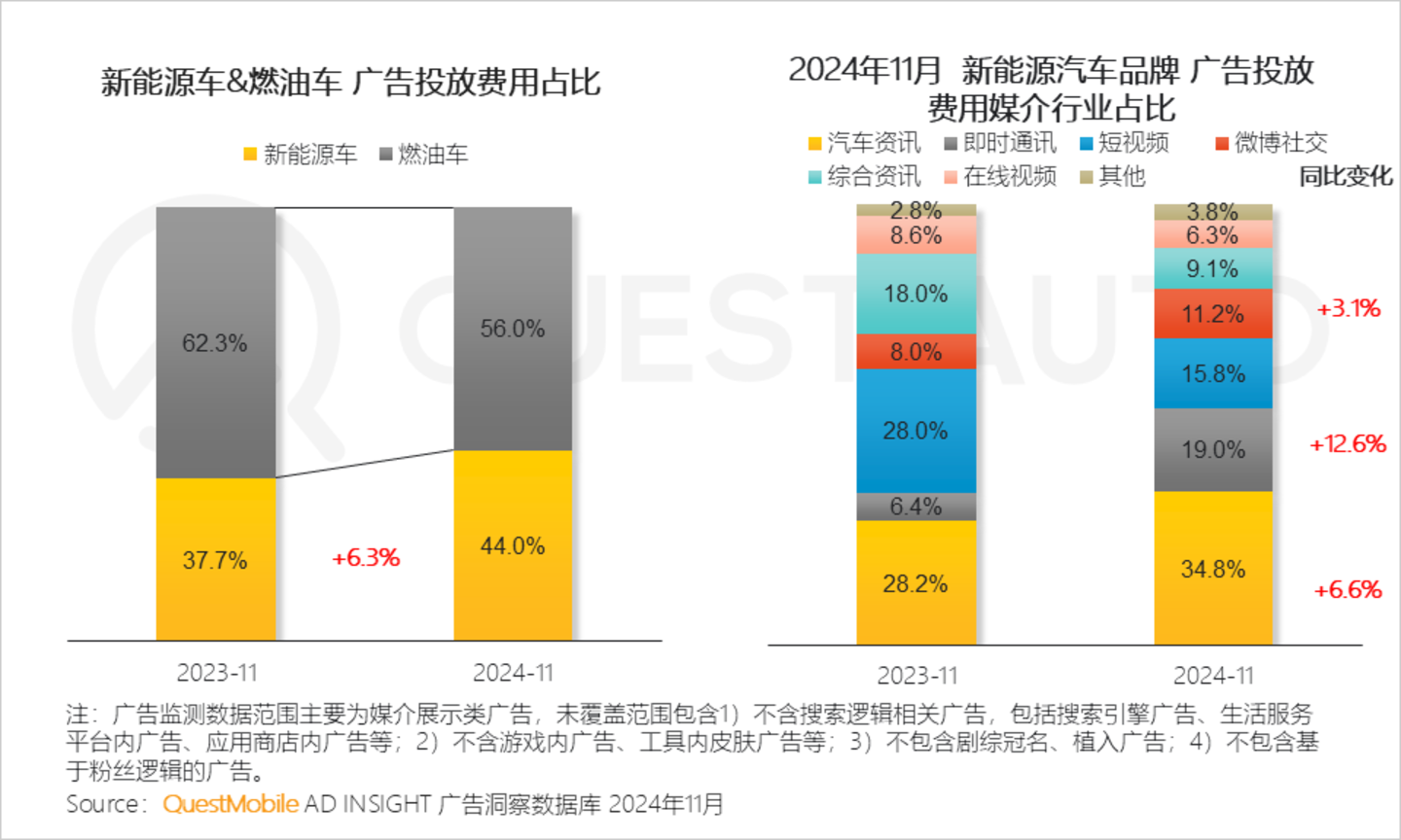1、新能源汽车广告投放费用同比有所增长,其中汽车资讯、即时通讯、微博社交行业的广告投放费用同比增长显著