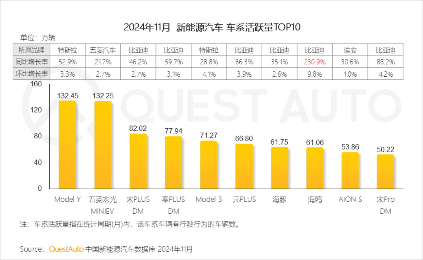 4、车系活跃量方面,TOP10厂商均实现同环比增长,Model Y领跑,五菱宏光MINIEV与之差距甚微,比亚迪旗下六款车系挺进前十,其中海鸥同比增长达230.9%