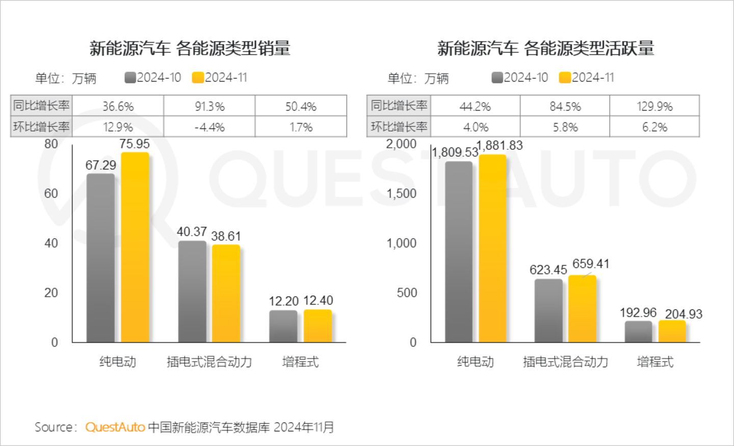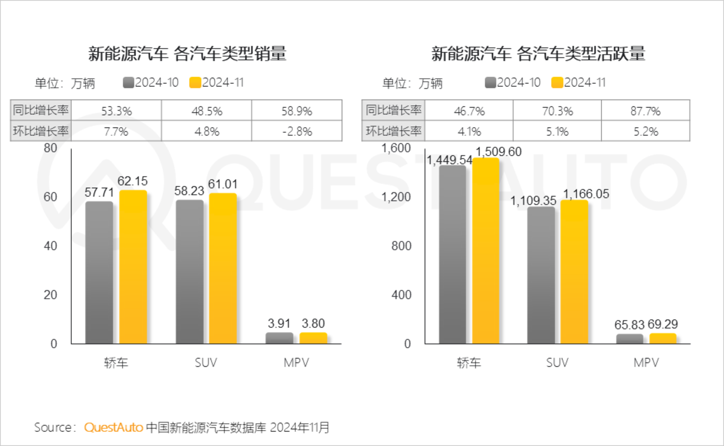 5、11月新能源汽车市场,轿车、SUV销量及活跃量同环比实现双增长,其中轿车、SUV销量均突破60万辆;MPV销量环比小幅下跌