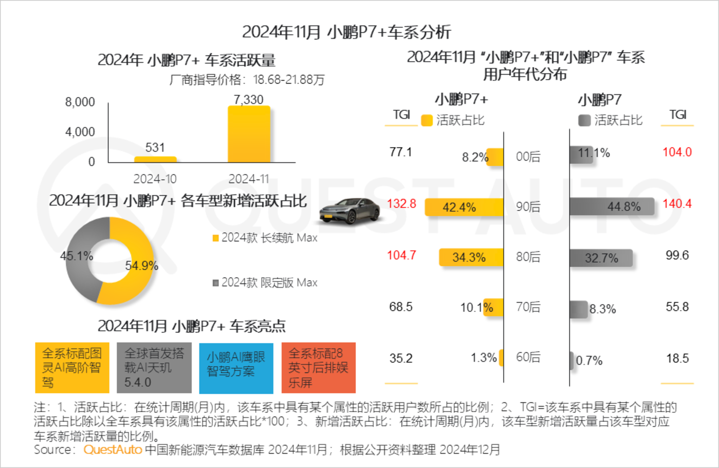 3、小鹏P7+作为P7系列的升级版车型,全系标配AI高阶智驾,新车首发搭载小鹏自研的AI天玑5.4.0及AI鹰眼智驾方案,相比P7而言用户倾向90后、80后人群