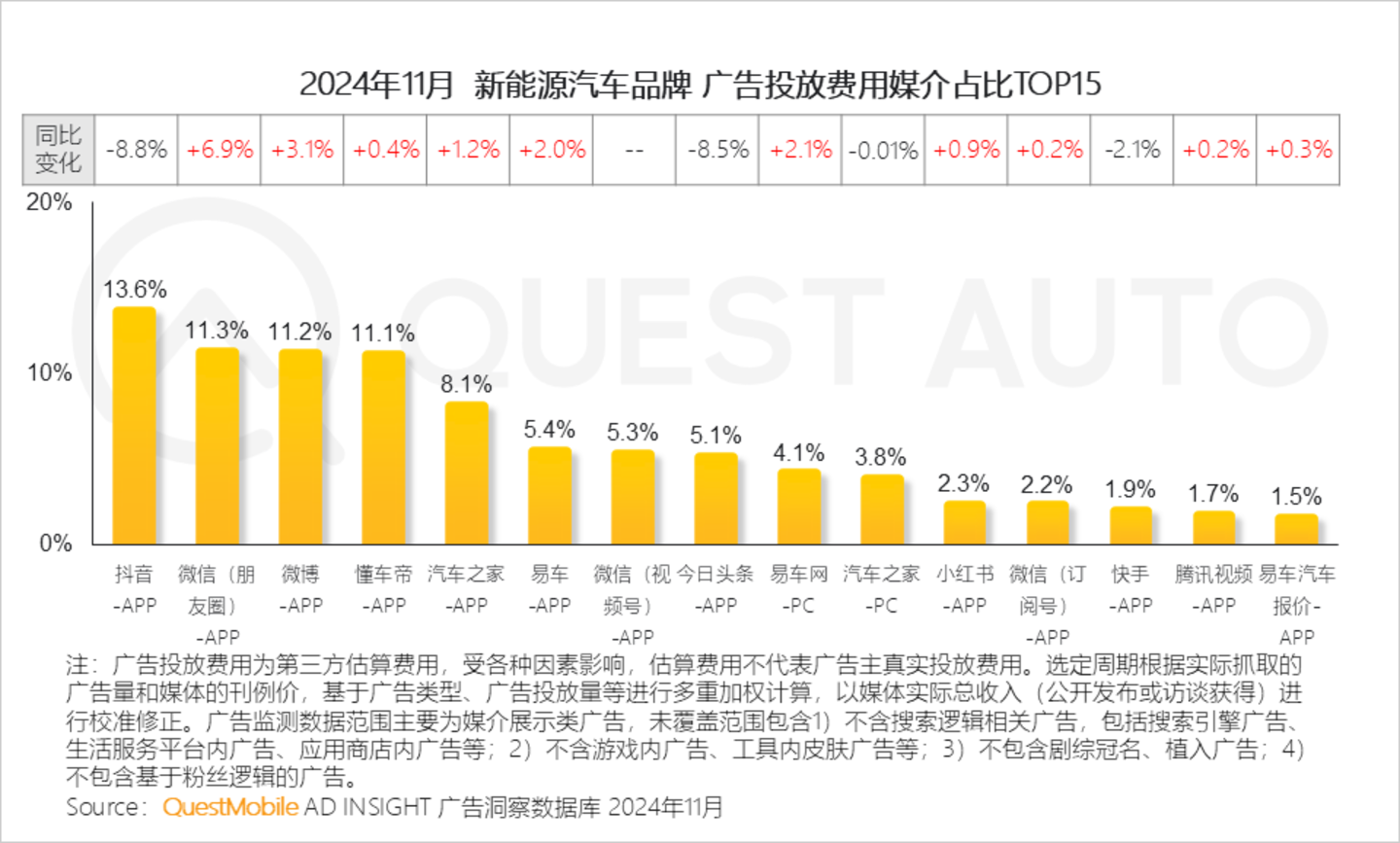 2、汽车资讯平台作为主要的广告投放阵地,车企在三大典型垂媒APP投放力度均增长,微信朋友圈/视频号、微博、小红书等新媒体平台也持续成为车企发力渠道