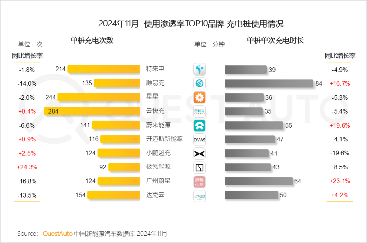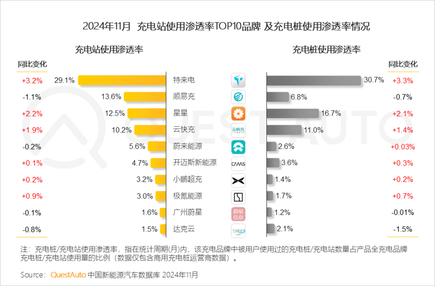 1、特来电、顺易充、星星占据充电站使用渗透率前三;此外,11月大部分充能设施使用渗透率同比有所增长