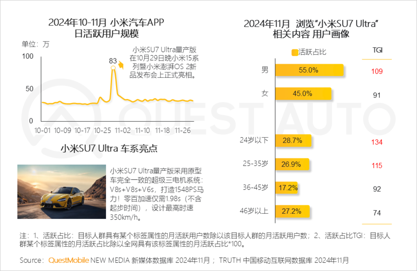 5、10月29日小米SU7 Ultra正式亮相为小米汽车APP吸引流量,助推流量达到本月峰值;该车以强劲马力、硬核性能吸引男性、35岁以下的用户广泛关注