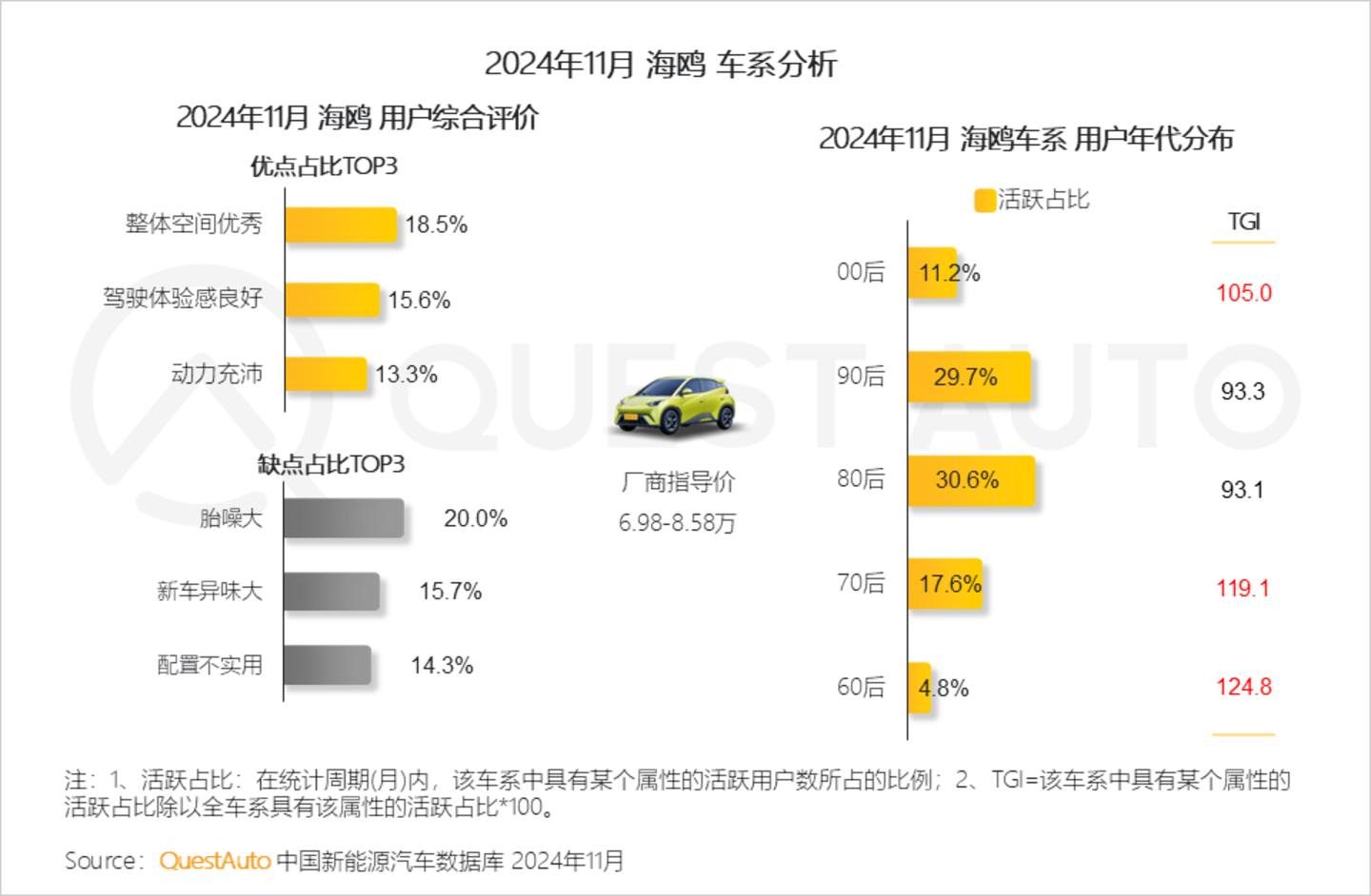 4、比亚迪旗下海鸥作为一款小型车在空间、驾驶体验、动力方面满足用户日常代步出行,获得用户广泛认可,此外,胎噪及新车异味等问题被用户吐槽