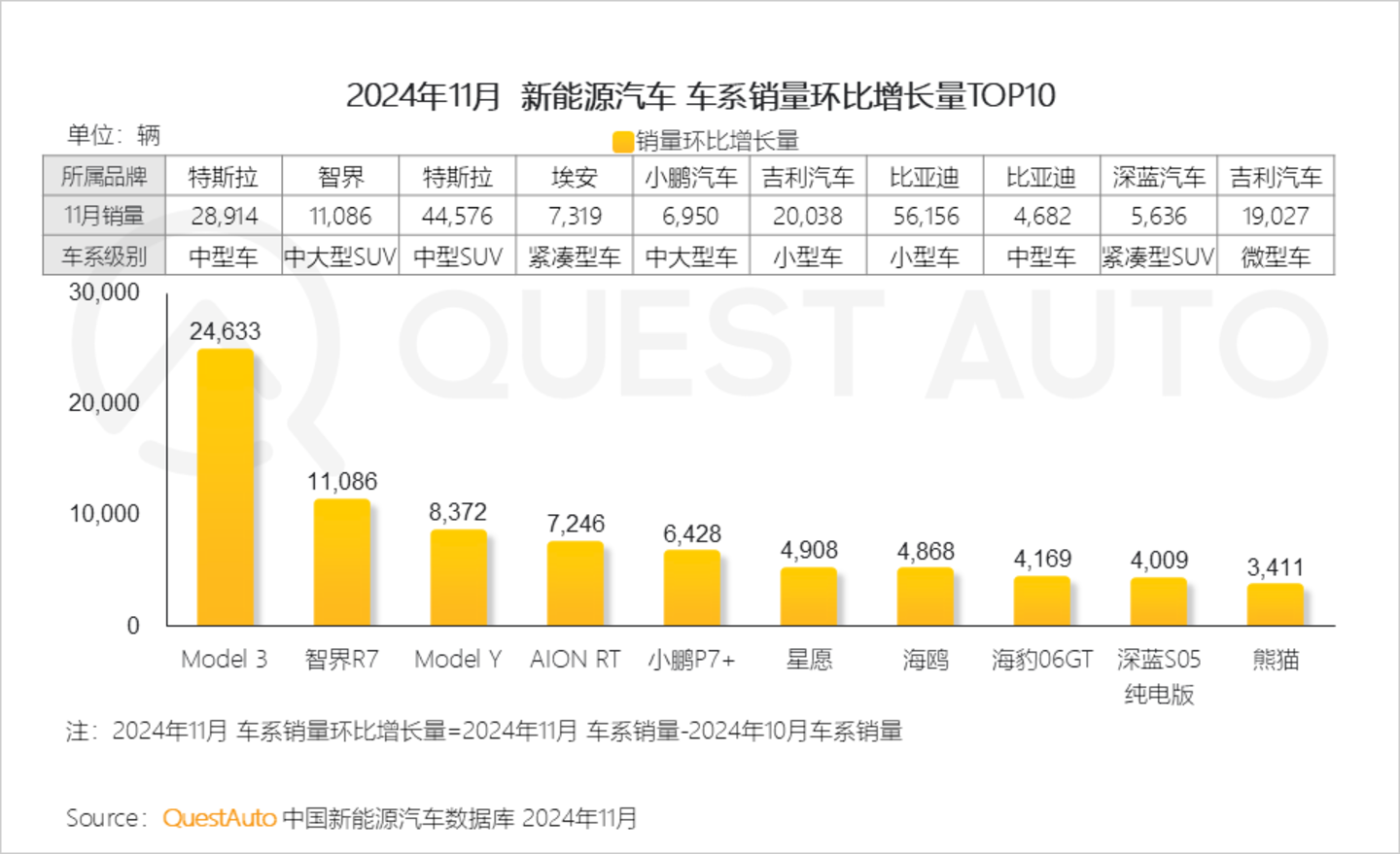 1、11月销量环比增量TOP10车系中,Model 3增量近2.5万辆,位列第一,智界R7增长量紧随其后突破1万辆,AION RT、小鹏P7+、星愿等近三月新上市车系增量也跻身前十