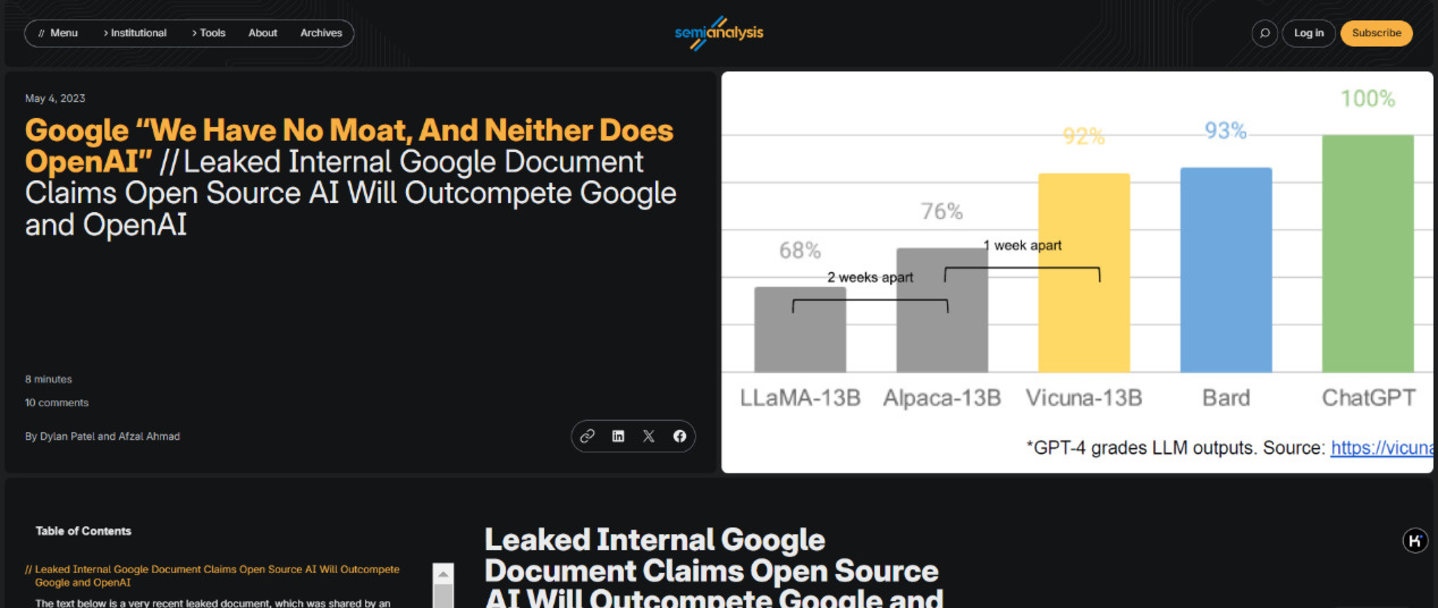 其中他指出,开源AI模型发展之迅速,使其很难形成强技术壁垒,即使现阶段其大模型的数据质量仍然稍有优势,但差距正在惊人地迅速缩小。特别是开源社区的创新和快速迭代能力,使得Google和OpenAI难以保持技术优势。