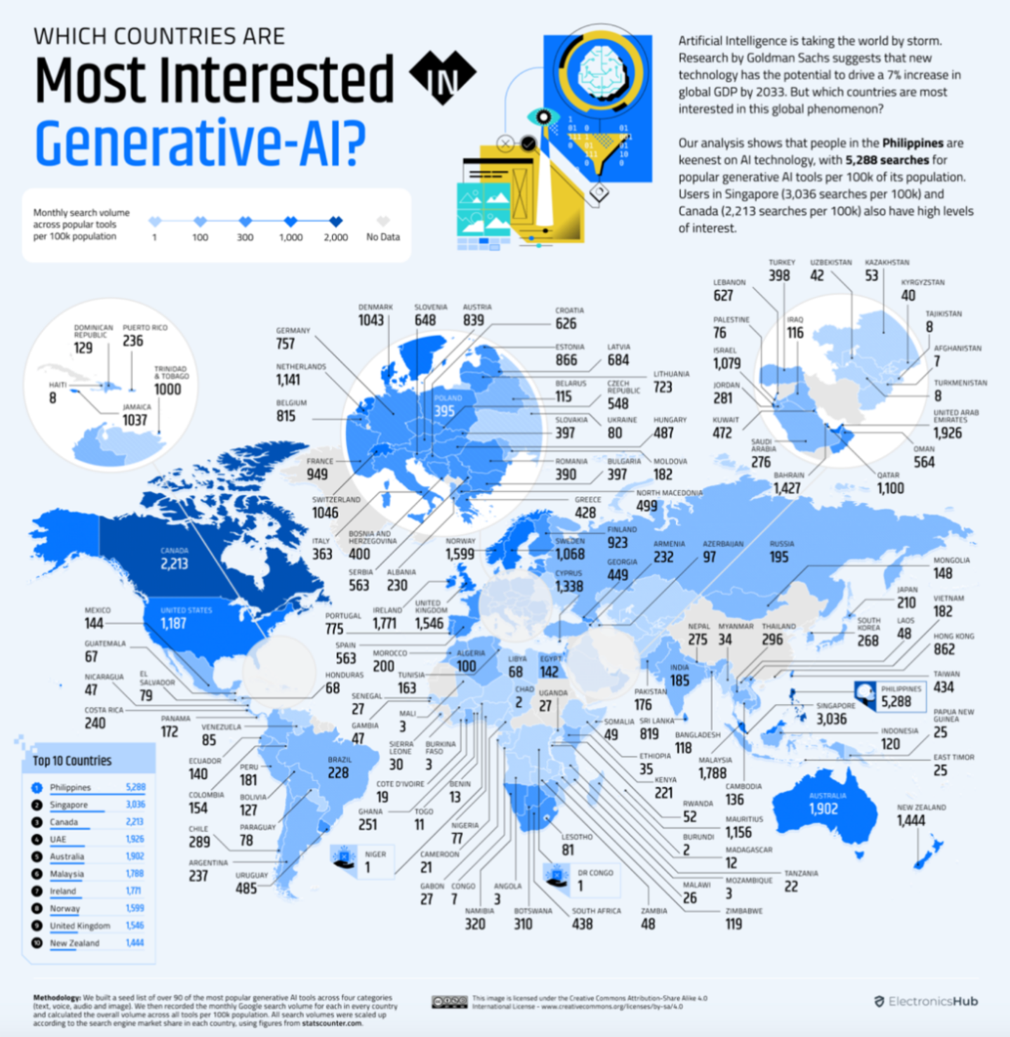 菲律宾的每10万人次中AI工具搜索量在所有调研国家中位列第一|图片来源:Electronicshub.org
