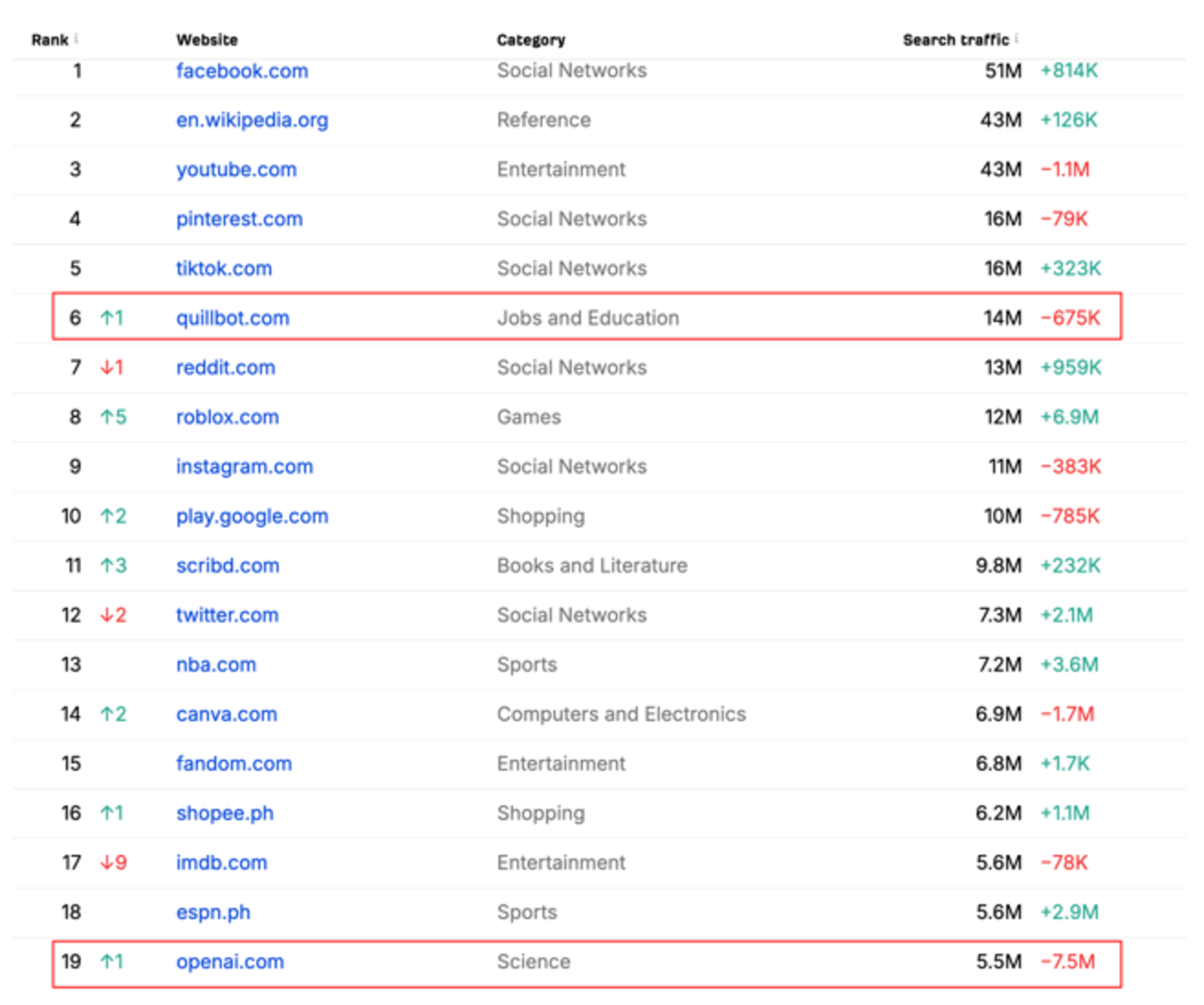 可能也是这种 AI 入侵工作岗位的迫切“威胁”,让更多菲律宾人认识到了 AI 具备可用性的一面,尤其是语言提升方面,在频繁地对外交流中 AI 能让菲律宾人更加如鱼得水。虽然菲律宾身上一直带着英语好的标签,但是英语始终作为第二语言,交付对象如果是英语母语者,或者是学术、公文写作等严肃场合,细纠语法和措辞就不是那么够用。于是我们看到 Quillbot 这样的 AI 写作助手能超车 ChatGPT 在菲律宾自然搜索量能排到 Top6,给个人生产力工具的产品指明了一个目标市场。