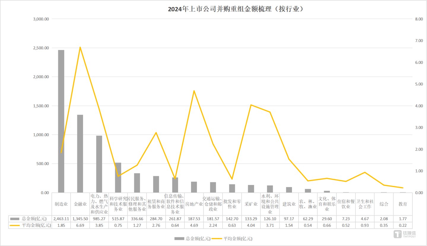 科股宝APP整理发现,截至12月中,2024年上市公司并购重组金额靠前的行业分别为制造业、金融业、电力热力燃气及水务、科学研究技术服务业等。