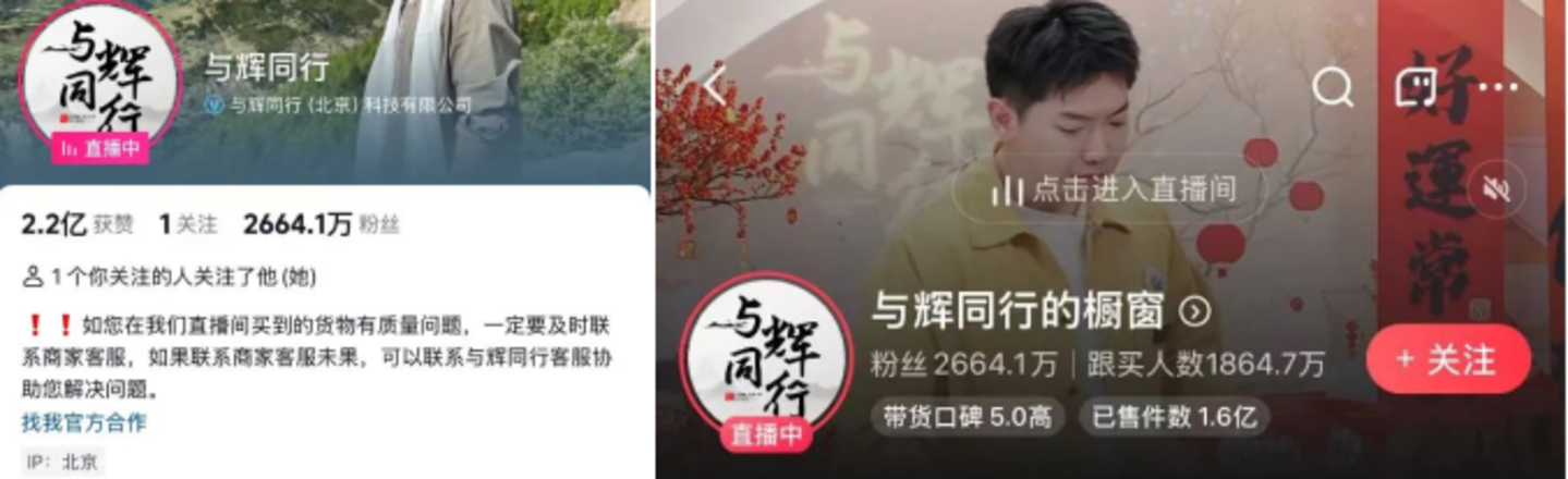 与辉同行的橱窗显示,带货口碑5.0,已售件数1.6亿,跟买人数达到了1864.7万。