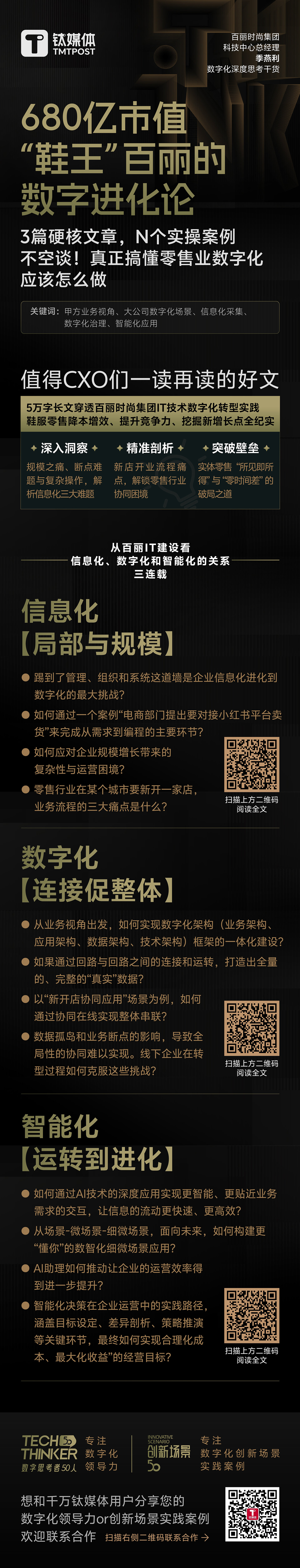 这一次,他和团队、合作伙伴一起以超过5万字的文章,从百丽的业务视角出发,依据多年企业管理、业务运营和IT技术摸索与实践的经验,系统阐述了信息化、数字化和智能化在现代企业中的应用与发展。根据上述不同建设阶段,经钛媒体编辑分为三部分连载,本文为第三部分智能化阶段的探索和经验。