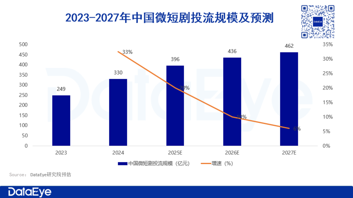 DataEye研究院预估:2024年微短剧投流规模约330亿元;预计2025年投流规模接近400亿,2027年投流规模有望超过460亿元。