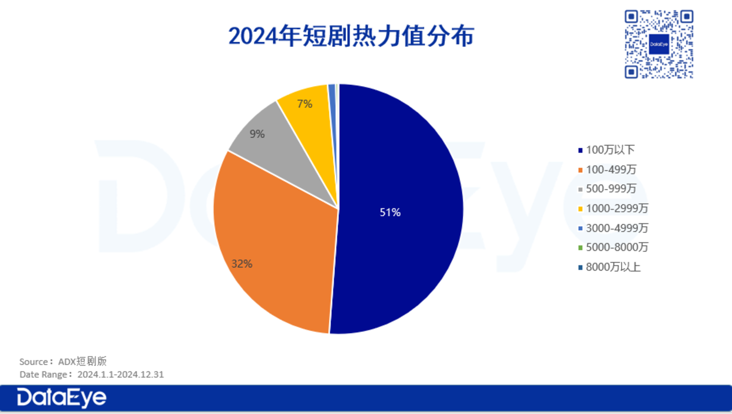 在2024年,大约一半的短剧(51%)累计热力值低于100万。