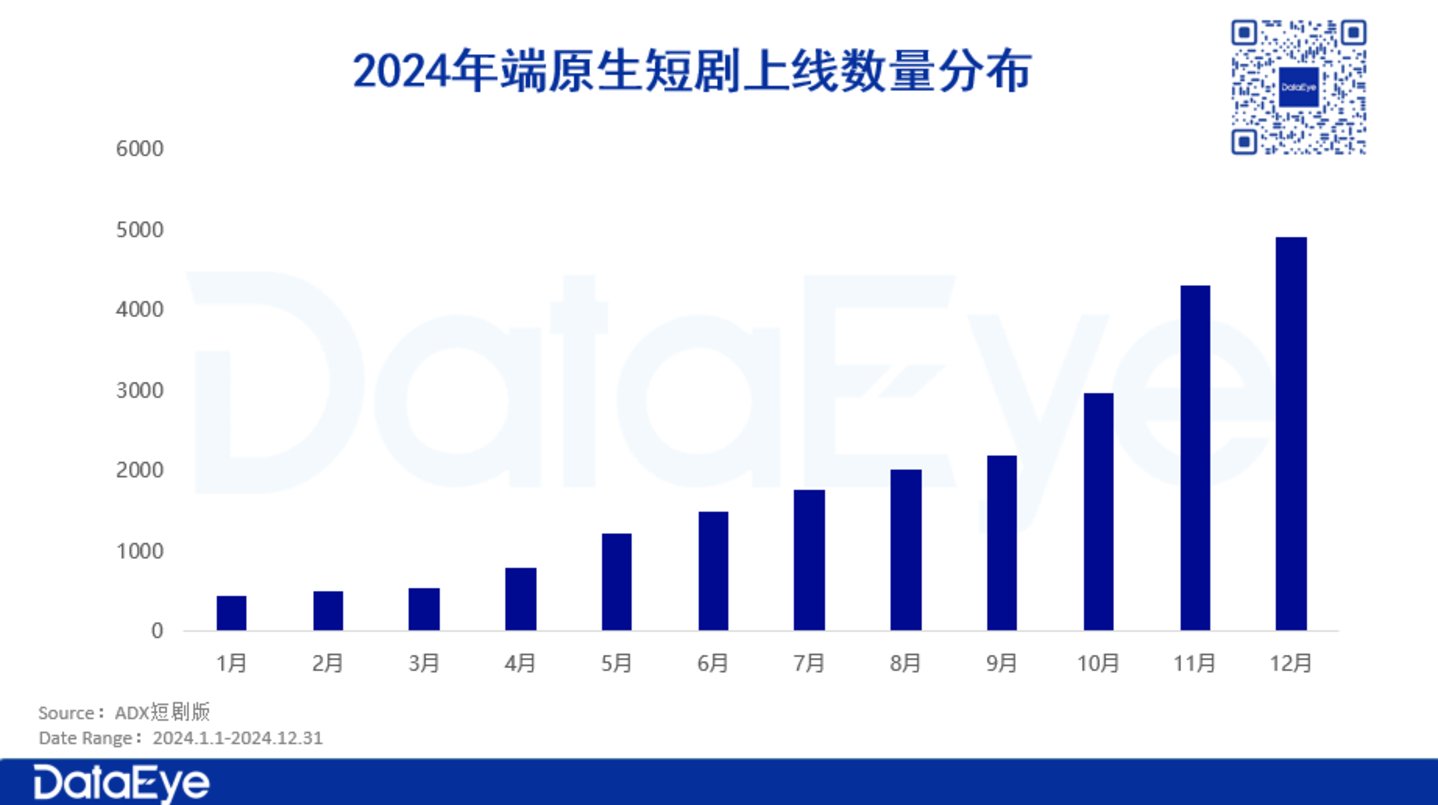 2024年,抖音端原生短剧市场极速飙升,全年上线的短剧数量突破了2万部。下半年增长尤为明显,11月起迎来了爆发式增长,11月上线短剧数量超过4300部,12月超过4900部。预计2025年抖音端原生短剧的数量有望进一步增加。