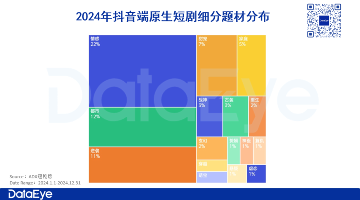 在2024年抖音端原生短剧中,女性题材内容占据了主导地位。
