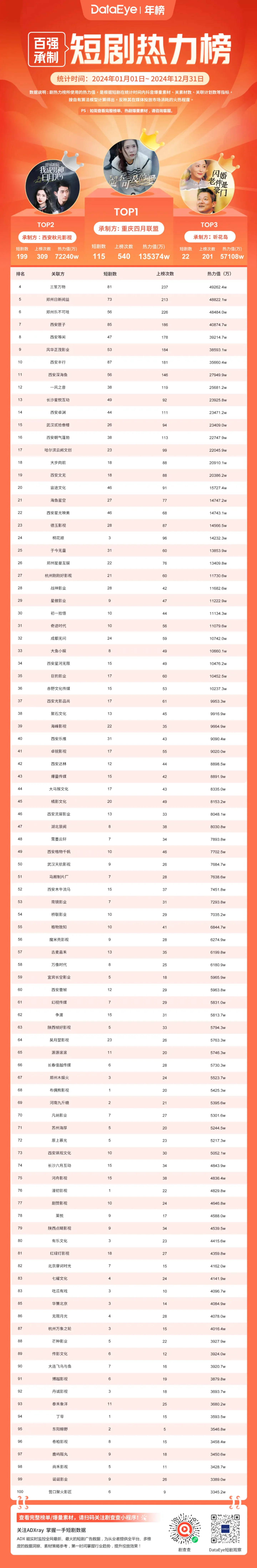 2024年度短剧百强榜—承制方:热力值总额超168亿,重庆四月联盟登顶,西安秋元影视、听花岛、三笙万物表现突出。