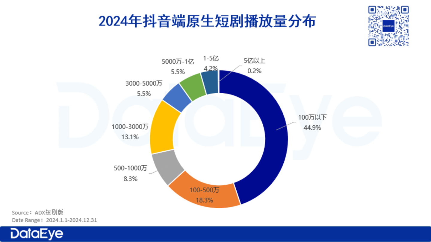 2024年,近半数(45%)短剧的累计播放量在100万以下。