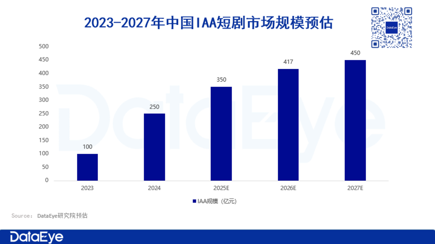 DataEye研究院预估:2024年中国IAA短剧市场规模约250亿元,预计2025年将增至约350亿元,在2027年有望达到450亿元。