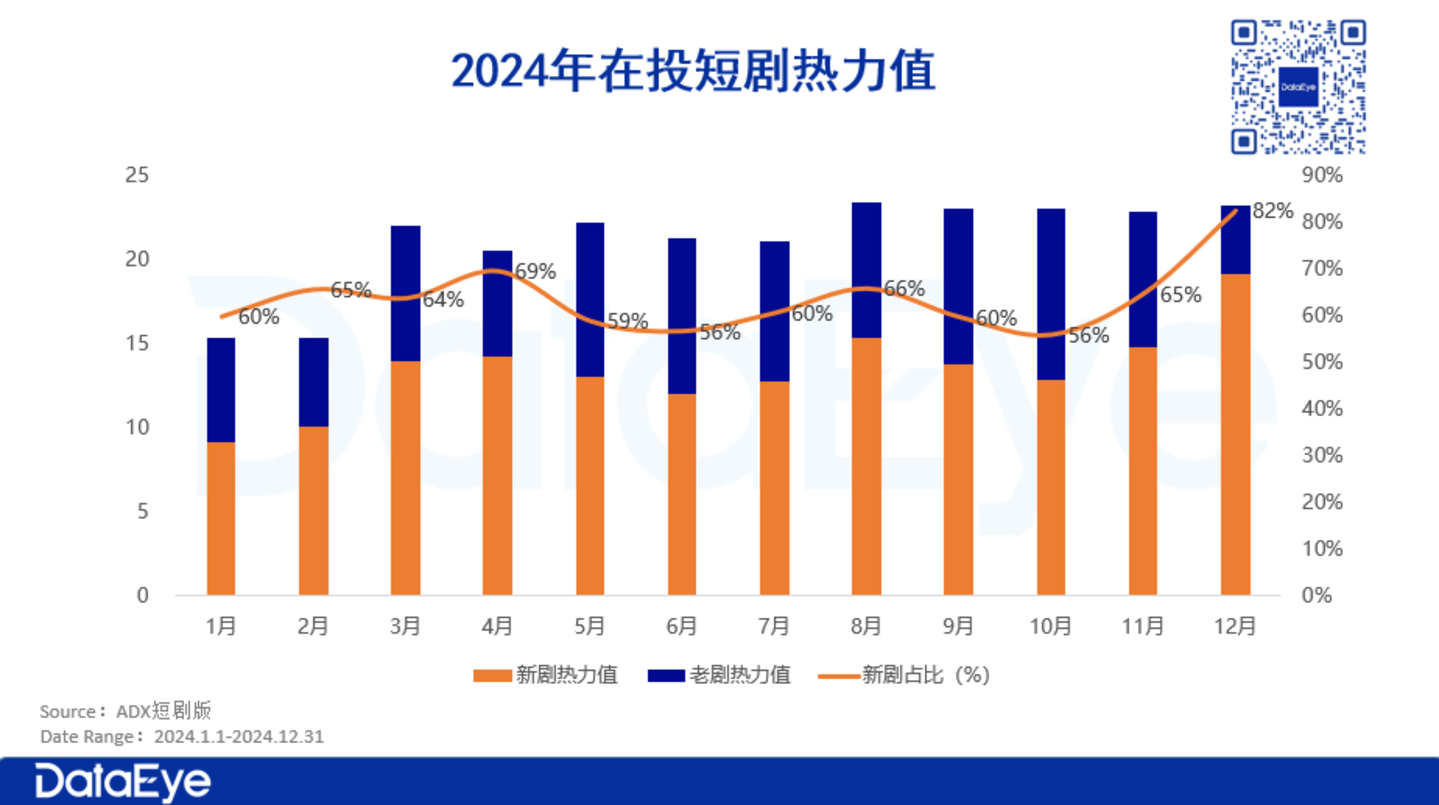 ADX短剧版数据显示:2024年新剧的热力值总额超过了160亿元,占比约64%。