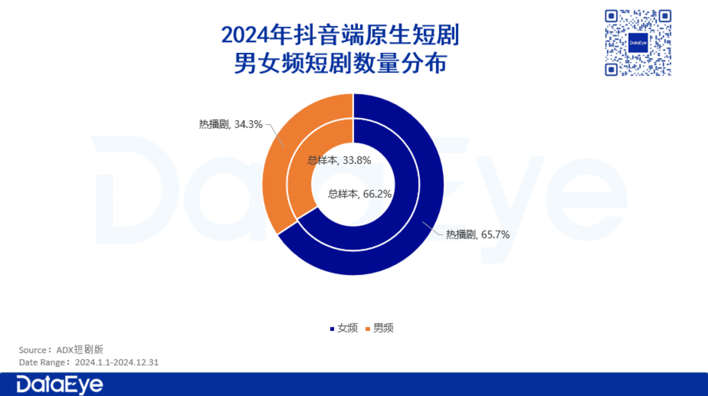 具体来看,无论是总样本还是播放量超过5000万的热门短剧,女频短剧均占总短剧数的66%左右,男频占34%左右。