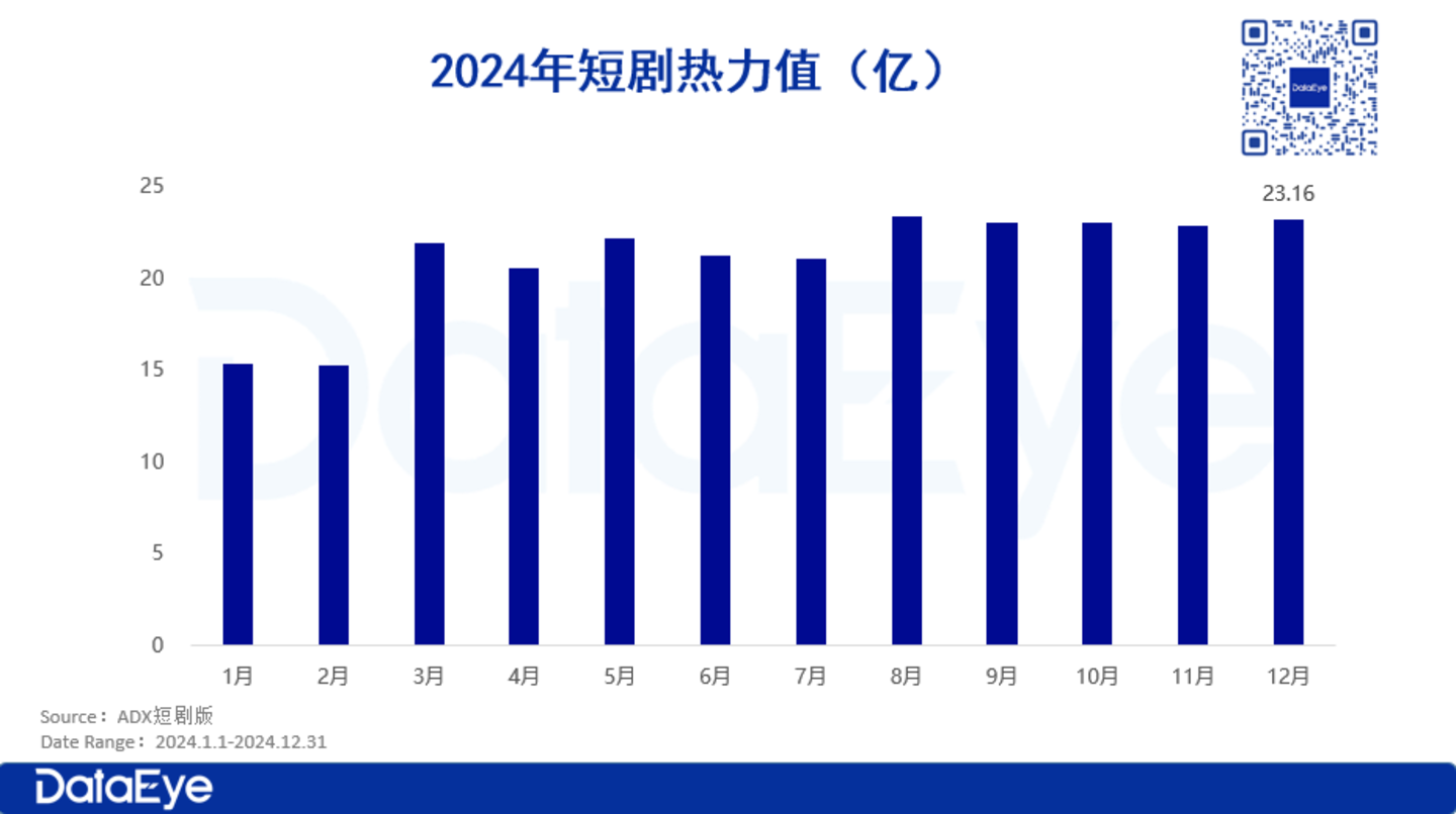 在2024年的前六个月,短剧的热力值整体呈上升趋势,6-7月受到监管等因素影响,短剧的热力值经历了小幅的调整。进入下半年,短剧的热力值逐渐趋于稳定,单月热力值维持在22-23亿元左右。