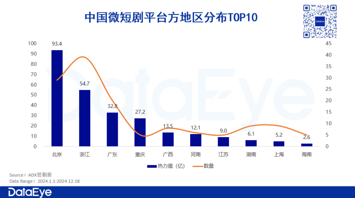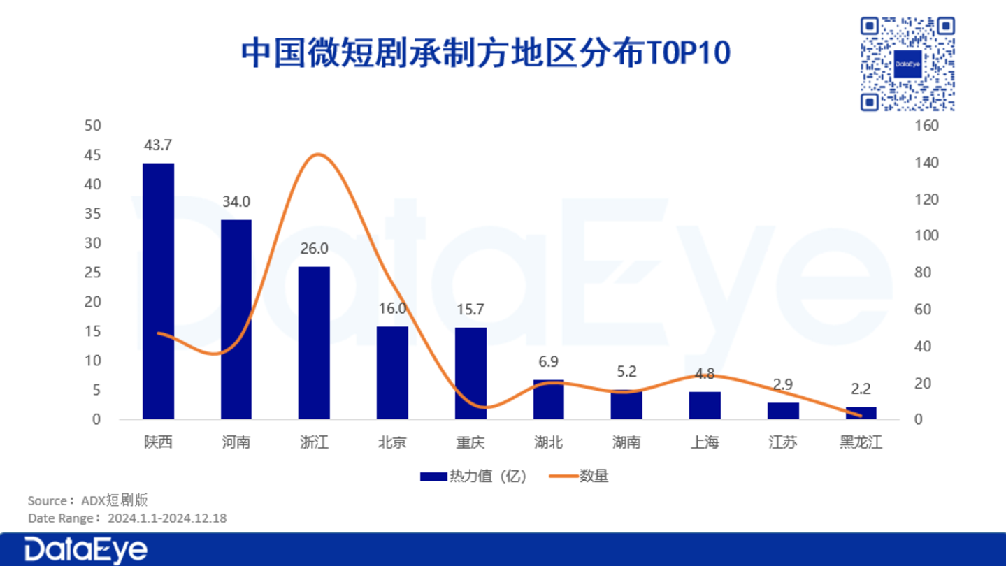 除了传统的影视重镇浙江和北京外,陕西、河南和重庆等地区也在短剧市场中崭露头角,展现出强劲的增长势头。