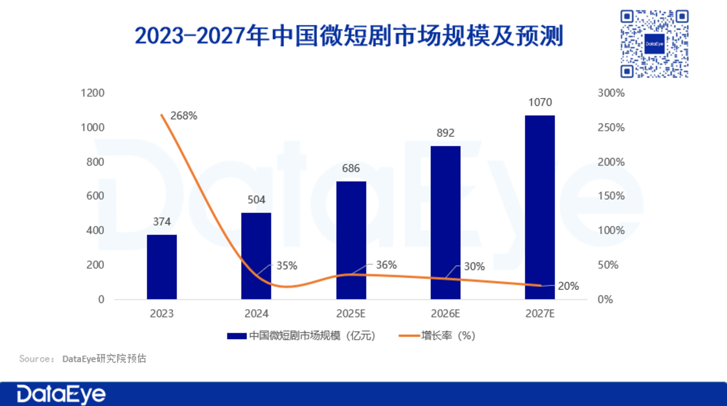 DataEye研究院预计:2024年中国微短剧市场规模达504亿,预计2025年将超过680亿,2027年将突破1000亿。