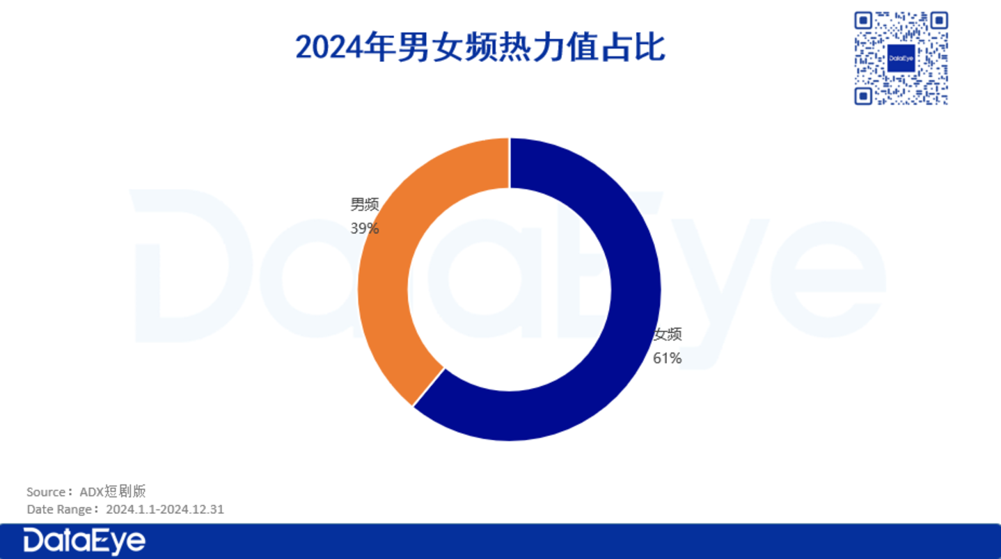 ADX短剧版数据显示:2024年男频热力值总额约99亿,女频约154亿。