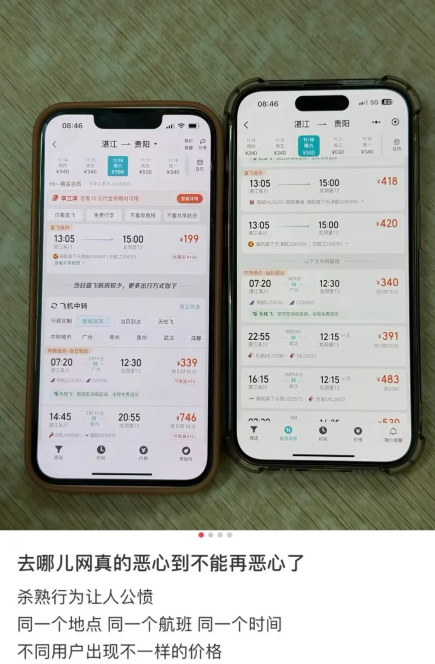 “不去了,机票涨那么多,亏我那么信任你,越看越涨,辜负了我对你的期待……去哪儿网、同程、飞猪,你们给我看好了,再涨价统统卸载……”