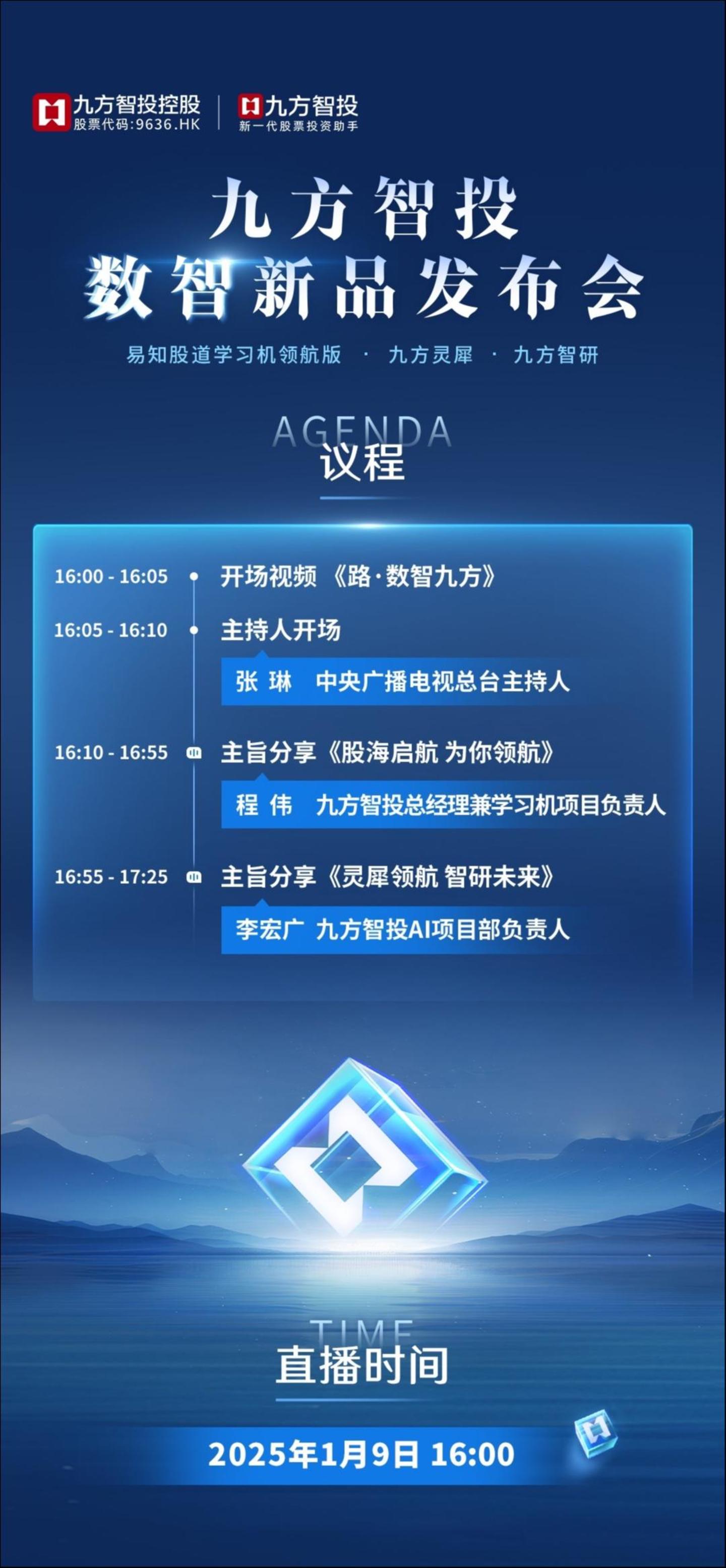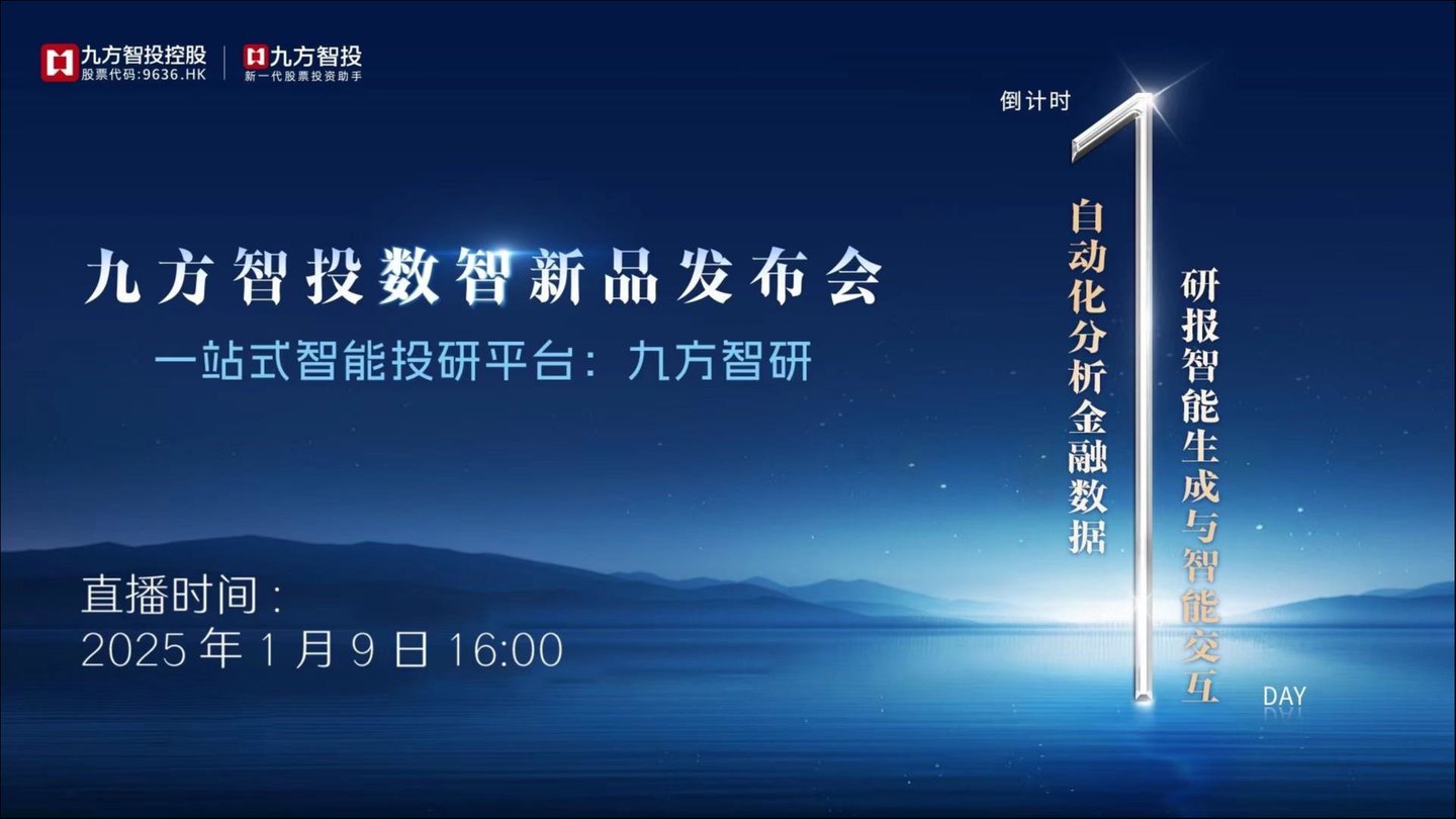 2025年1月9日16时,九方智投控股(9636.HK)旗下九方智投数智新品发布会将在上海开幕。除了发布九方智投股票学习机“易知股道”领航版以外,两款数智创新AI产品“九方灵犀”与“九方智研”也将正式面世,敬请提前锁定。