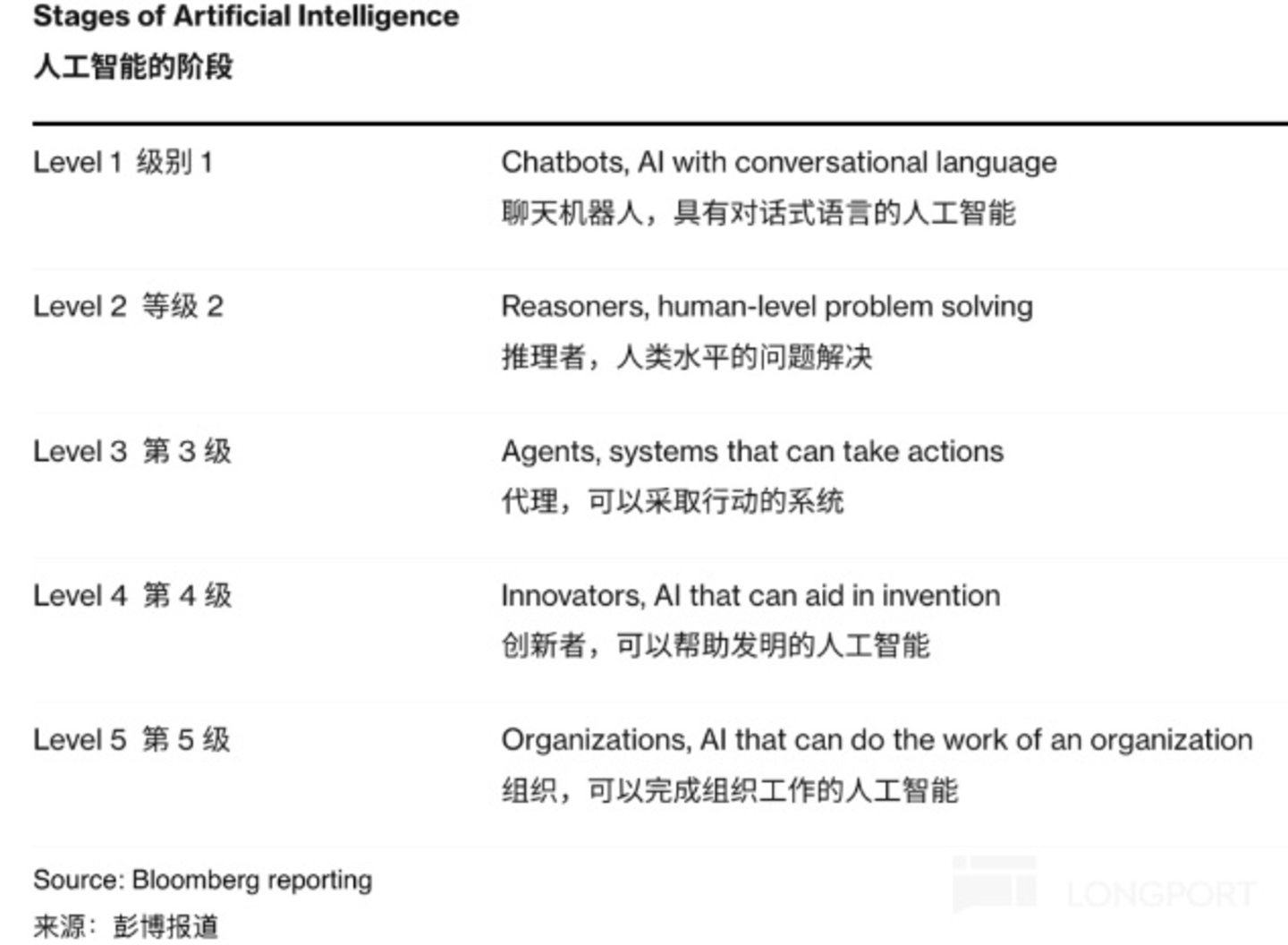 高度概括的说,“AI Agent” 相比先前各类 “Chatbot” 或 “AI assistant” 的差异主要在--AI 由 “工具性” 向 “主体性(或者说自主性)” 进化程度的不同。按 OpenAI 的设想,AI 技术通向真正 AGI(Artificial General Intelligence)的发展可分为 5 个阶段。其中,第一阶段是具备自然语言交互能力的聊天机器人;第二阶端的 AI 则具备了一定推理和问题解决能力;第三阶段即 “AI agent”,其与第二阶段 AI 技术的本质差别在,“AI agent” 不仅能提供解决方案,同时还具备自主执行解决方案的能力。