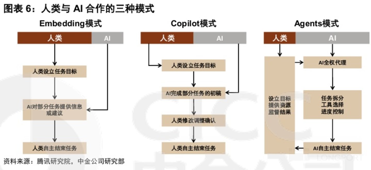 ② 而 “AI Agent”(在技术成熟的理想状态下)则能够“以目标为导向”。AI agent 能自行收集必须信息、判断拆解达成目标所需的步骤、和最终落地执行的动作。人类只需要给 AI agent 设定需要实现的目标或结果,并提供所需的资源和监督。换言之,AI agent 可以类比为人类领导下的 “数字版” 员工(即管理层多次提及的 “Digital labour”),而不再仅仅是工具。