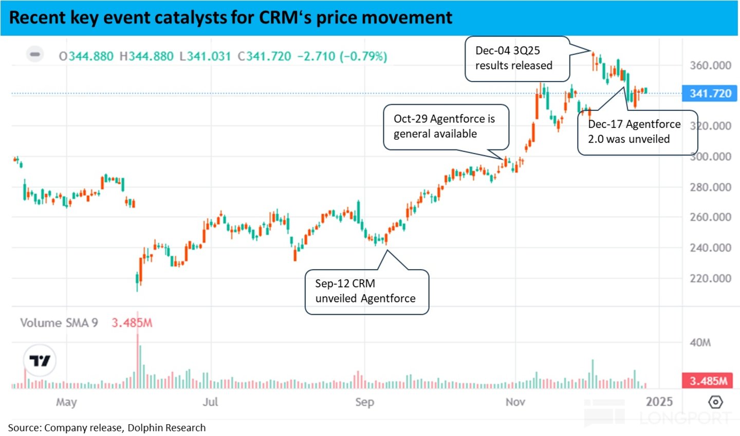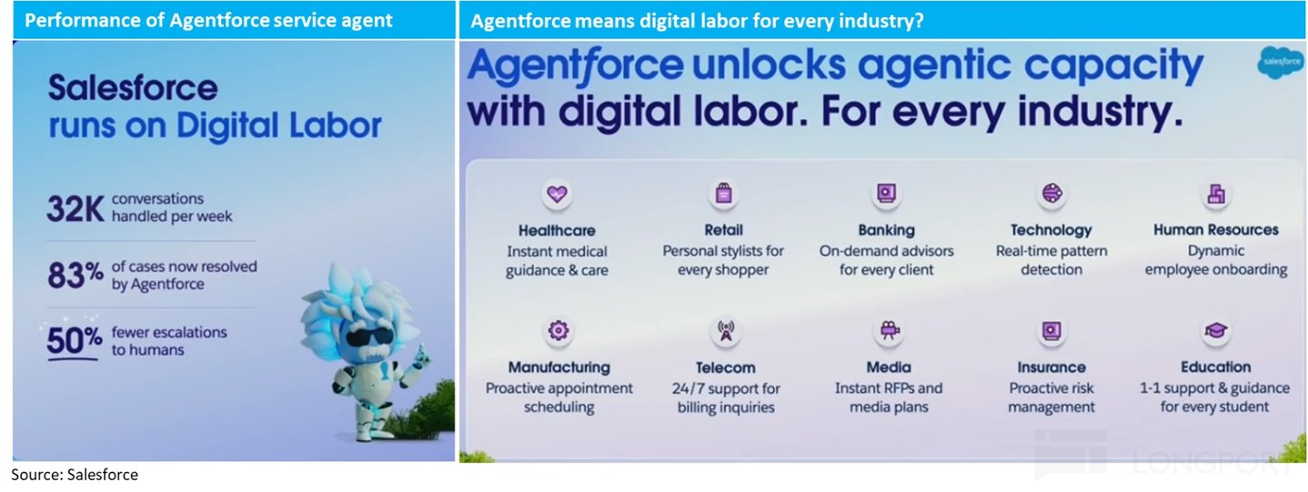 小结来看,3Q 当季业绩除了有所提速的 cPRO 增长外并无显著亮点,对 4Q 的指引更是在全部关键指标上都边际变差,看起来并不值得业绩后 10% 的涨幅。且近期 Salesforce 股价突破的节点,都于 Agentforce 的推出和上线的节点精准的一致。经过上述简要复盘,海豚投研认为,近期 Salesforce 股价的强劲表现,与近期的业绩基本面并无多大关联,主要是由于市场对 Agentforce--“AI agent” 概念下最早的商业实例的前景的乐观预期和提前反映。