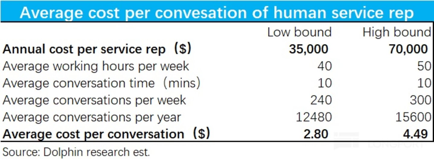 以目前 Agentforce 落地最顺畅的 service agent 为例,目前 Salesforce 对 service agent 的定价是$2 per conversation(实际有可能会提供一定折扣)。相比之下,据行业调研人工客服平均应答一次问询(conversation)的成本大约在$2.7~$5.6 之间。作为交叉验证,我们自行做了测算:① 据查询,美国平均一个客服员工的年工资大约在$35,000~$70,000 左右;② 按单个员工平均每周工作时间在 40~50 小时左右(有可能会更高);③ 假设平均每次沟通花费时间为 10 分钟(包括空闲等待时间)。按上述假设,海豚投研自行测算的人工客服单次沟通成本大约在$2.8~$4.5 左右,和市场调研的数据接近。