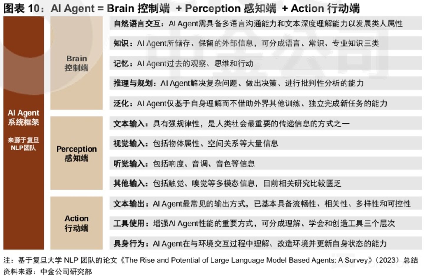 如前文所述,成熟的 AI agent 有能力自行完成信息收集、分析决策、落地执行,因此成熟的 AI agent 就需要兼具三大模块: