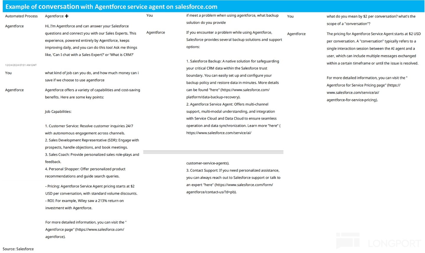 海豚投研的主观看法,Agentforce 的语言理解和沟通能力相比 ChatGPT 等主流 LLM 大模型,我们没有感受到明显差异。不过在用词的规范、防止 “幻觉” 或 “胡言乱语”、拒绝回答不相关问题等方面,Agentforce 相比 ChatGPT 等 C 端产品,对回答质量的 “下限” 要求更高。