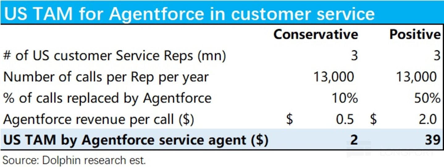 据调研,美国目前约有 300 万在职的人工客服岗位,参考我们以上的测算,单个人工客服一年处理 1.3 万次客户的问询,那么基于保守和乐观情景下的渗透率和单次沟通的定价,海豚投研测算出Agentforce 在客服市场有望取得的市场空间可达$20~$390 亿之间。相比 Salesforce 在 FY25 年约$90 亿的 Service cloud 收入,保守情景下$20 亿增量市场规模并算不上可观(何况这还没考虑到其他竞争对手也可能推出类似服务的竞争)。而理想状态下,AI agent 需要取得相当可观的对人工的替代率(比如至少 3~5 成),以及和人类员工接近的能力而收取较高的定价(如$2 每次沟通),才有望带来数倍于当前收入规模的增量空间。