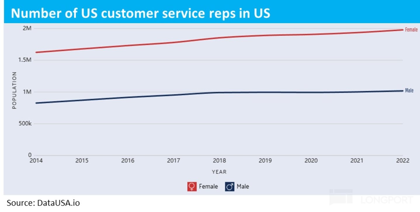 通过以上分析可见,Agentforce 提供的 “Digital labour” 在理想状态下(假设 Agentforce 的工作能力接近人类员工)确实能够帮助企业用户节省相当可观的人力成本,因此有希望吸引企业用户采用 Agentforce 来替代人力员工。那么下一个问题是,以美国客服(customer service)为例,Agentforce 理论上的潜在市场有多大?