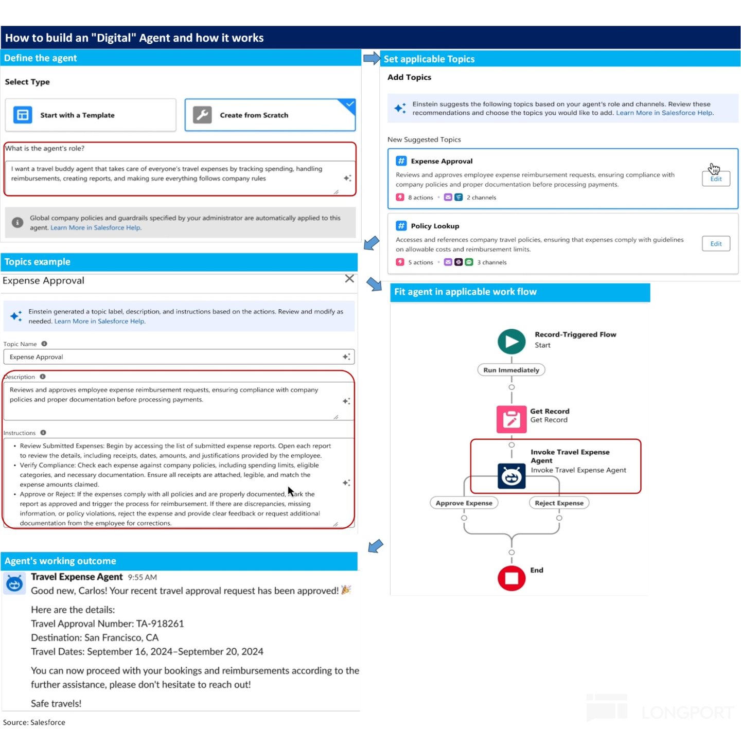不过从普通使用者,以及投资人的视角,高深的技术能力和行业知识更多只是一个不易理解的 “黑箱”。我们从更形象具体的角度--通过 Agenforce 搭建一个负责处理费用报销申请的 Agent 的案例来看, Agentforce 到底是如何运作的: