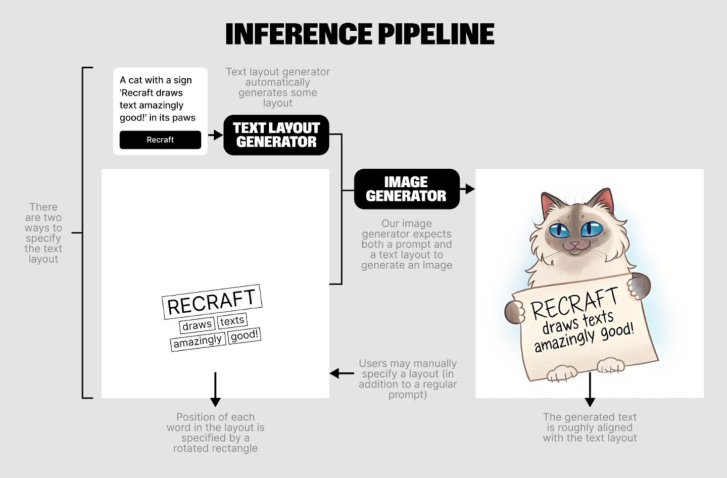 作者注:Recraft 团队在《How To Create SOTA Image Generation with Text: Recraft’s ML Team Insights》中解释过他们的训练原理,包括文字生成器和图像生成器,他们通过绘制文本布局,来给模型提供更详细的输入条件,实现图像中的文本生成。