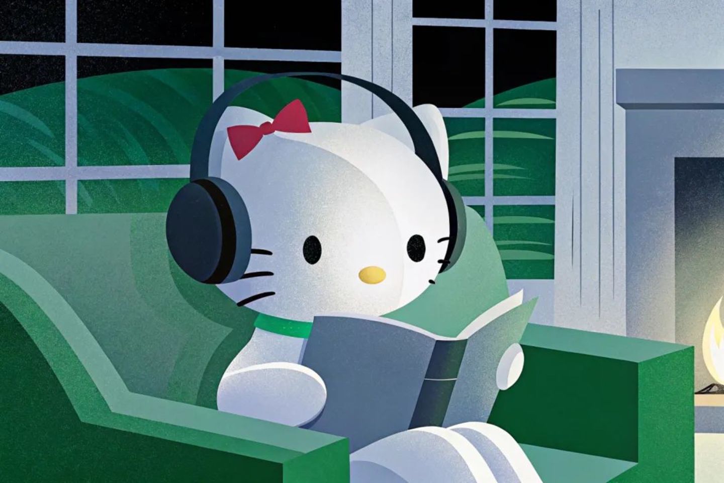 ● Recraft上有不同风格预设,以上图片为同一提示词“Hello Kitty is wearing headphones and reading a book on the sofa. The background is a warm room with a fireplace”,分别应用Hard Flash、Retro Snapshot、Multicolor、Grain 2.0、Neon Calm风格。